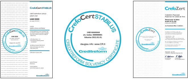 Kas yra CrefoCert STABILUS?CrefoCert STABILUS – tai oficialus UAB Creditreform Lietuva patvirtinimas, kad jį gavusi įmonė daugiau kaip vienerius metus yra moki ir geros ekonominės būklės. Įvertinimą CrefoCert STABILUS gavusios įmonės UAB Creditreform Lietuva administruojamoje Lietuvos įmonių bazėje CR.lt rodomos su ženklu CrefoCert STABILUS. Minėtas įvertinimas suteikiamas tik UAB Creditreform Lietuva iniciatyva, jei įmonė atitinka reikalavimus, ir nėra parduodamas. CrefoCert STABILUS privalumai